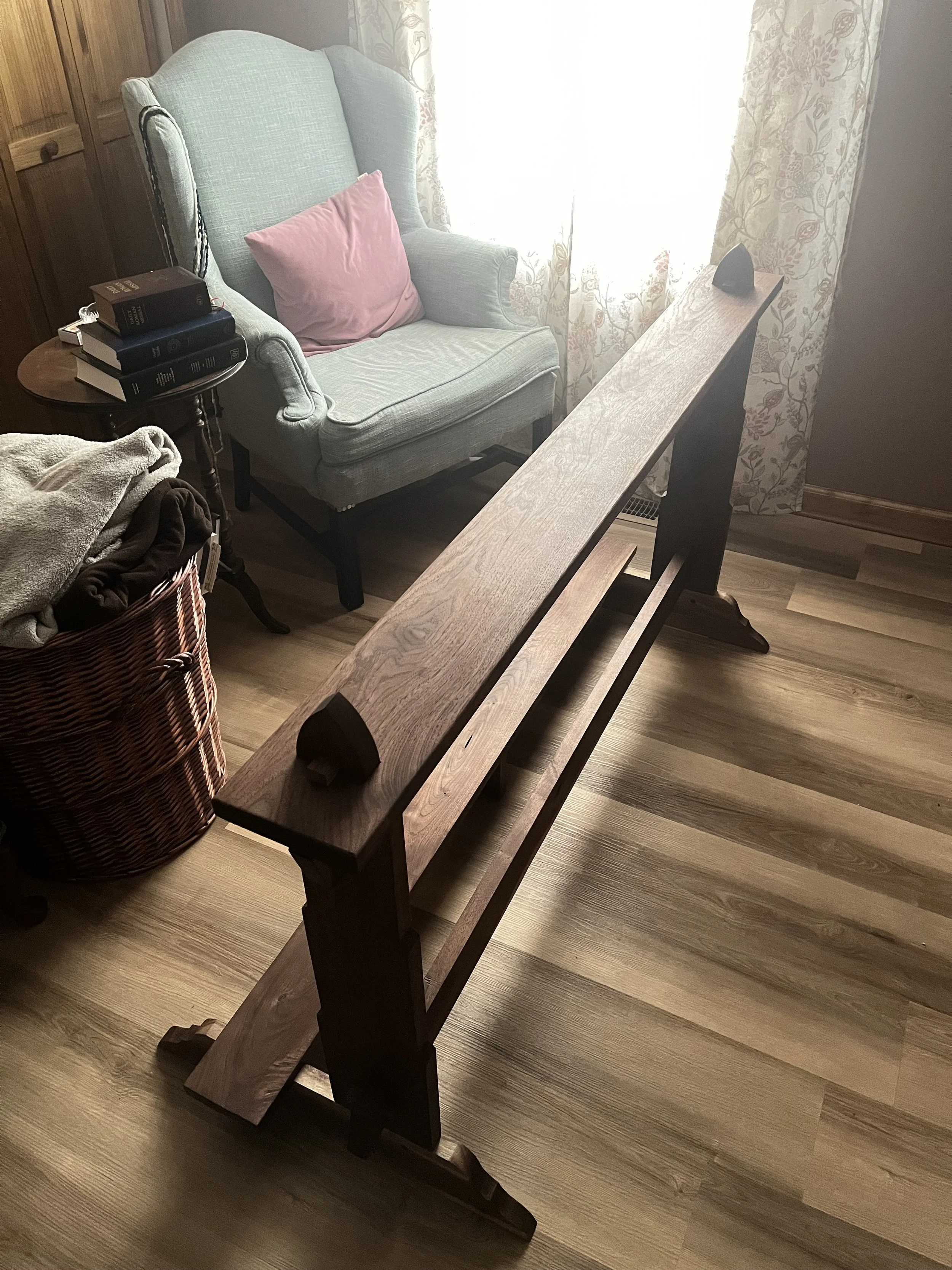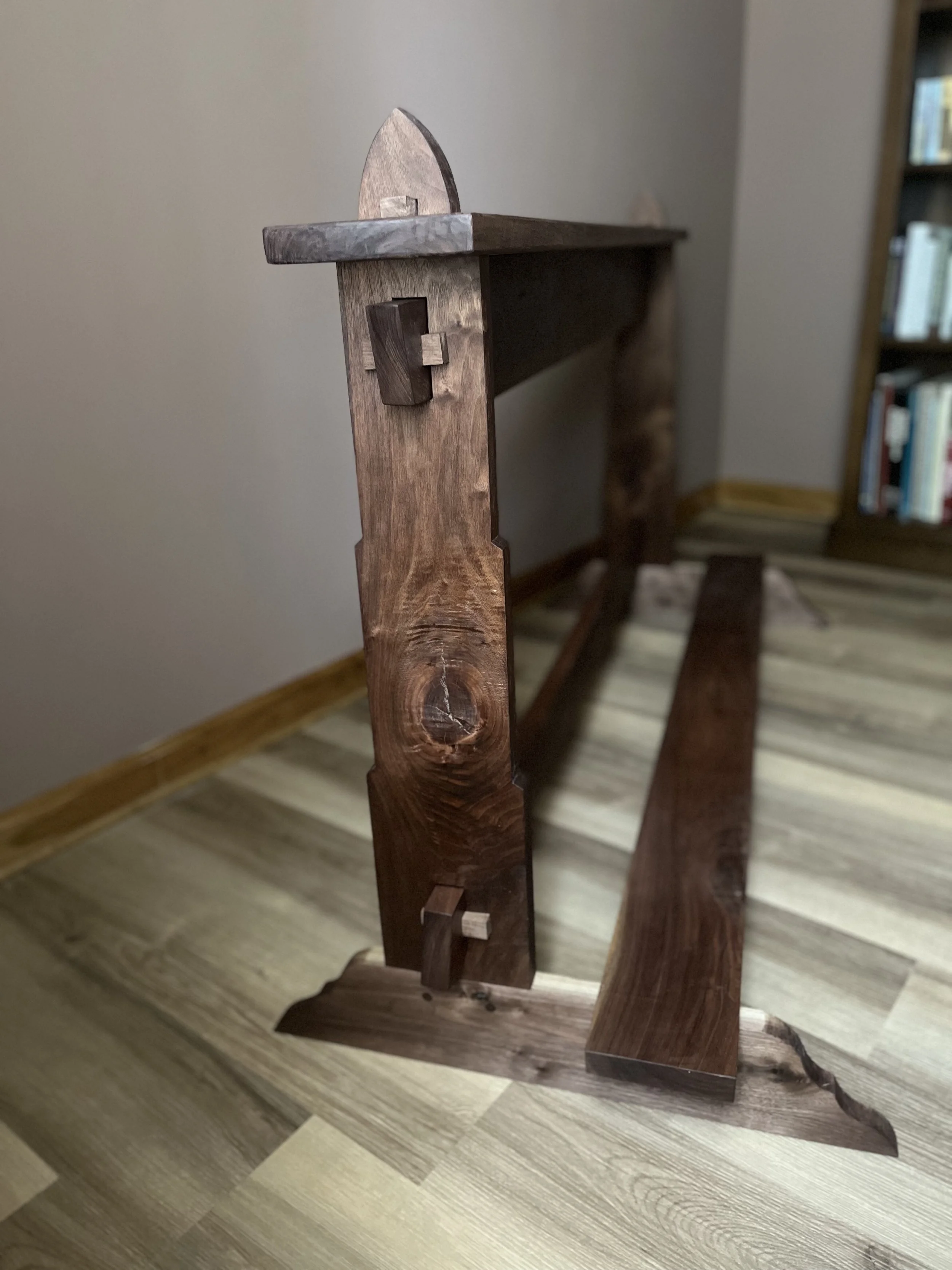 The tusk tenons make it possible to take the kneeler apart to move it or store it - a traditional approach to knock down furniture. Its peaked sides are inspired by the shape of gothic arches.